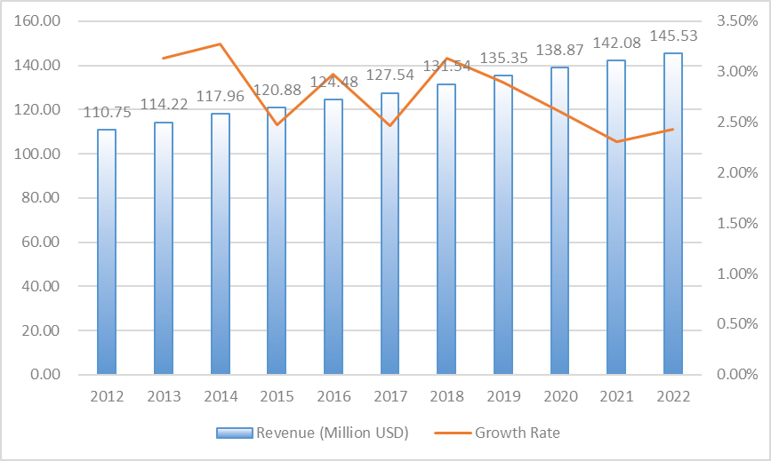 圖:2012-2022年全球LiNbO3晶體收入(百萬(wàn)美元)和增長(zhǎng)率