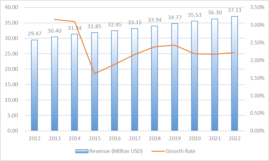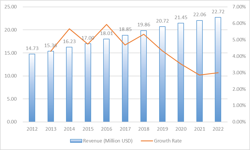 圖:2012-2022年中國(guó)LiNbO3晶體收入(百萬(wàn)美元)和增長(zhǎng)率