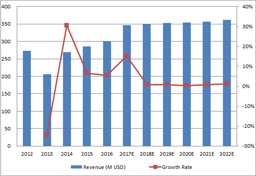 12.1.2全球倒裝芯片鍵合器收入(百萬美元)和增長率(%)預(yù)測(2017-2022年)