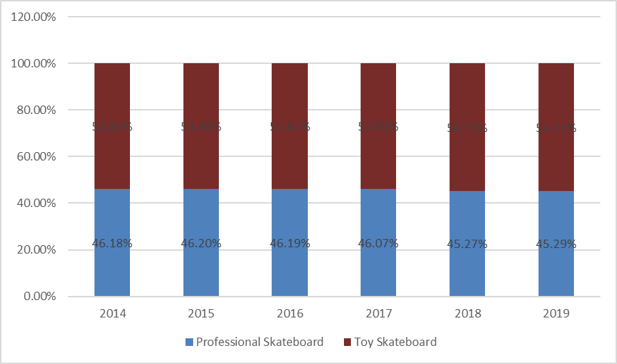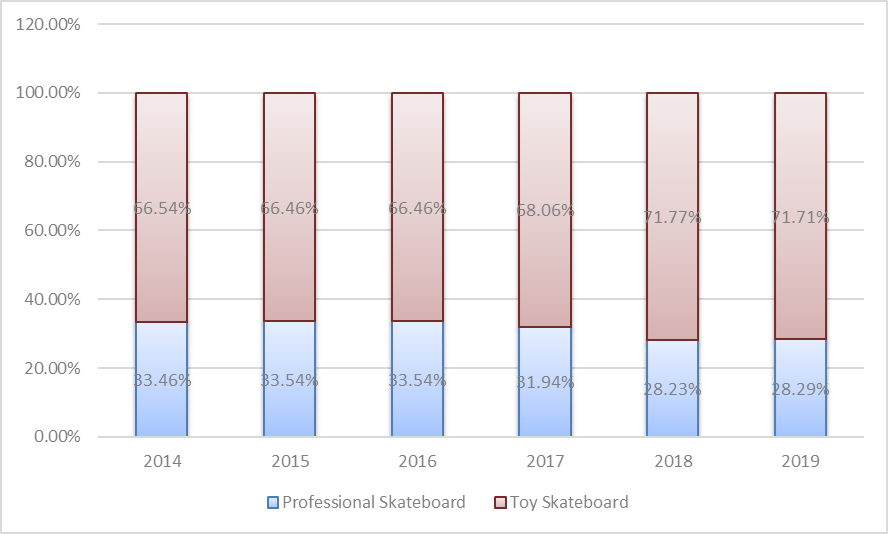 4.據市場調研數(shù)據顯示,從2014年到2019年,玩具滑板在過去六年中在全球市場保持了66%到73%的增長趨勢;青年人約占70%的市場份額。