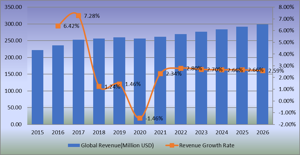 圖:全球耐油涂料收入(百萬美元)和增長率(2015-2026年)