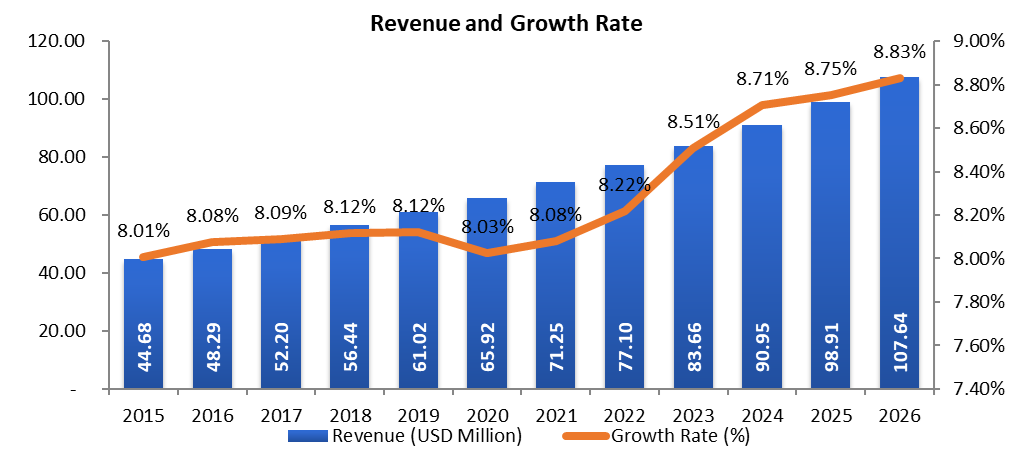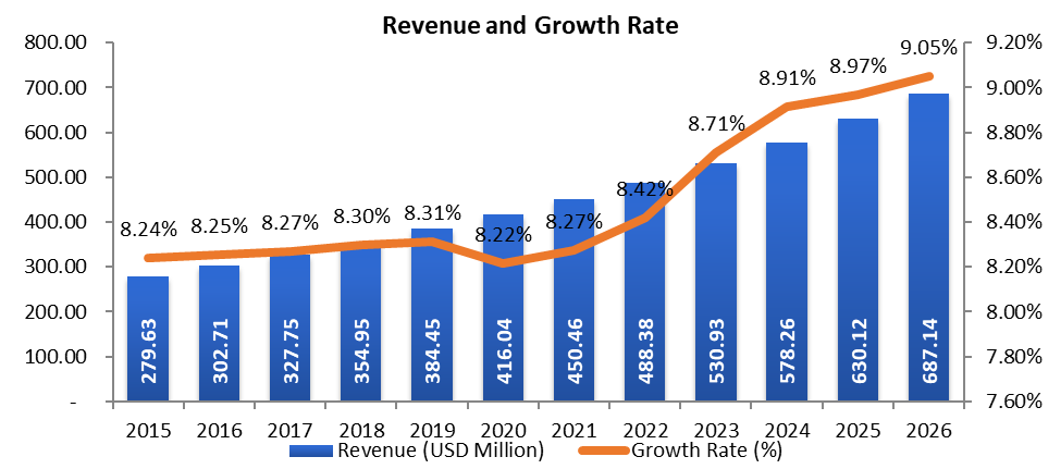 圖:2016-2026年全球異氰脲酸酯生物殺滅劑收入(百萬(wàn)美元)和全球增長(zhǎng)率